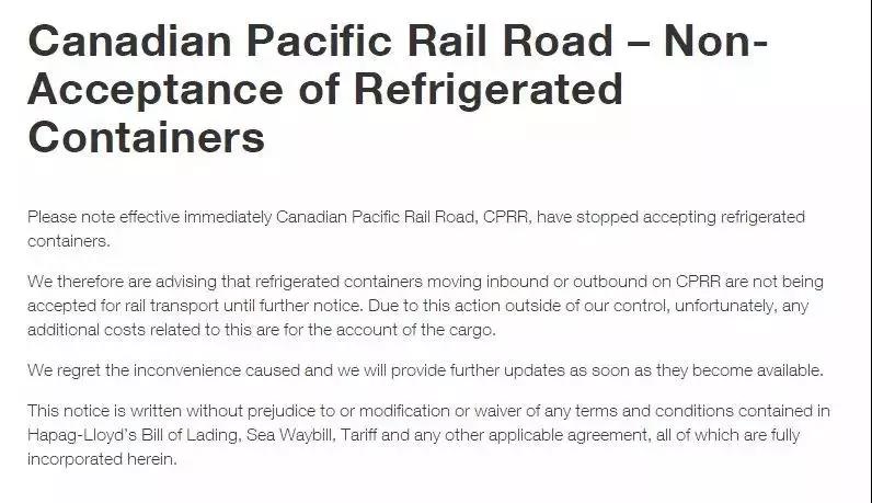 據(jù)悉,近日加拿大太平洋鐵路有限公司(CPRR)宣布,從即刻起不再接受冷藏集裝箱! 外貿(mào)貨代企業(yè)需特別注意,入站或出站的冷藏集裝箱在CPRR都將不能再用鐵路運(yùn)輸了。 從Hapag-Lloyd 官方發(fā)出停收去往...